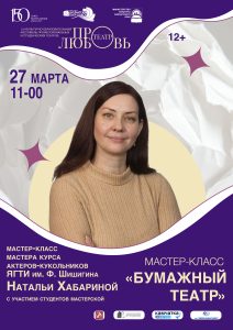 РУКИ, ТЕЛО, БУМАГА: три дня удивительных открытий! В рамках 5-го юбилейного фестиваля «ПРО.ЛЮБОВЬ.ТЕАТР» Наталья Хабарина – мастер курса актеров-кукольников Ярославского государственного театрального института и ее талантливые студенты 4-го курса представят целую серию уникальных мастер-классов, которые раскроют разные грани искусства оживления!