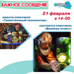 21 февраля в 14:00 по техническим причинам вместо спектакля “Таинственный гиппопотам” будет показана добрая и глубокая сказка “Великан-эгоист”.